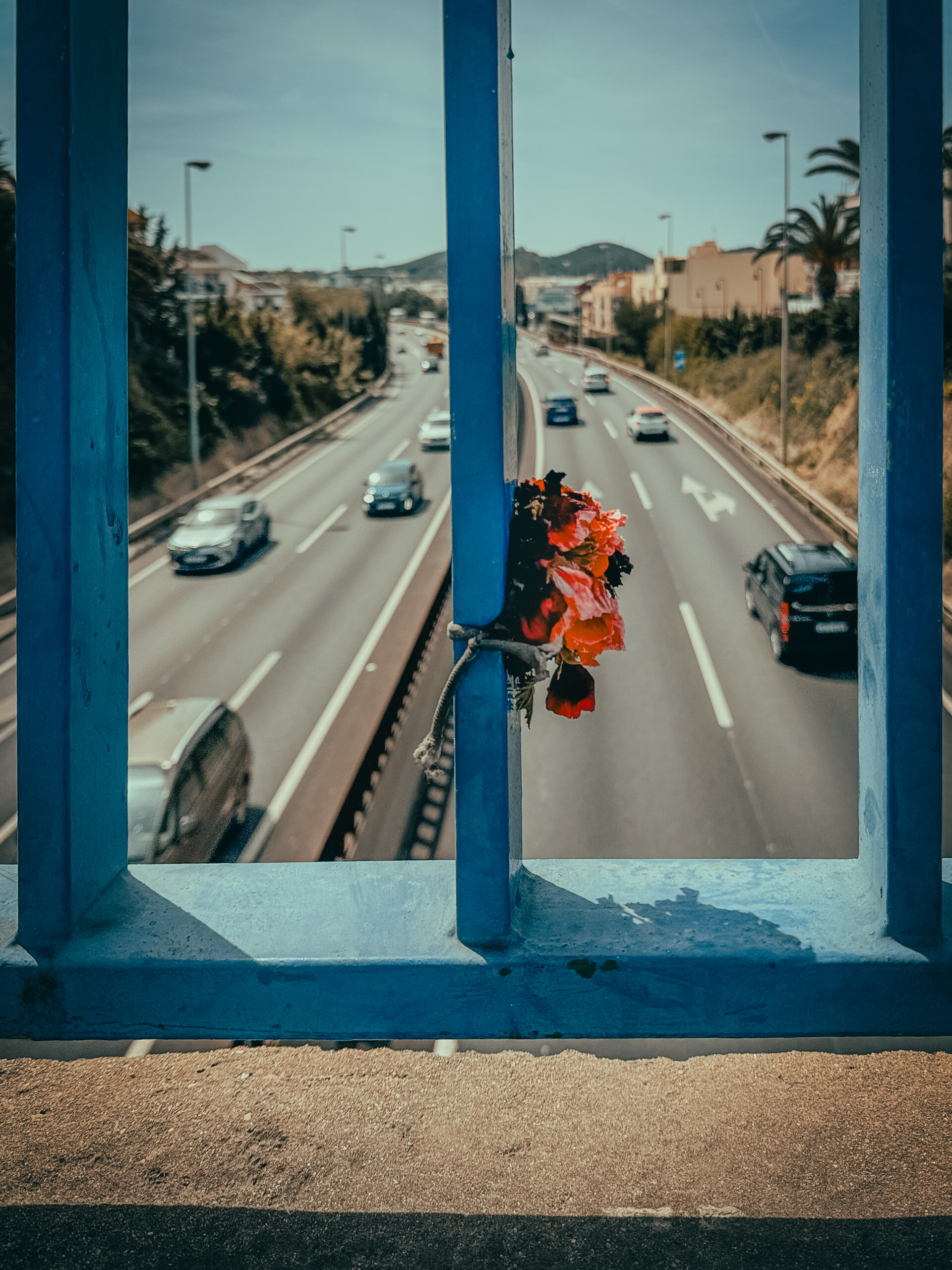 El porque alguien en un puente de los que cruzan una autovía, en pequeñito coloca unas flores apenas perceptibles, es algo que tan solo sabe precisamente esa persona que lo puso. Sea como fuere en algo tan impersonal y horroroso como un puente de estos, un toque de color y porque no de melancolía, dan una buena sensación, aunque uno no pueda evitar pensar, que es por algo luctuoso, yo por eso prefiero pensar que alguien quiso poner color allá donde no lo había.